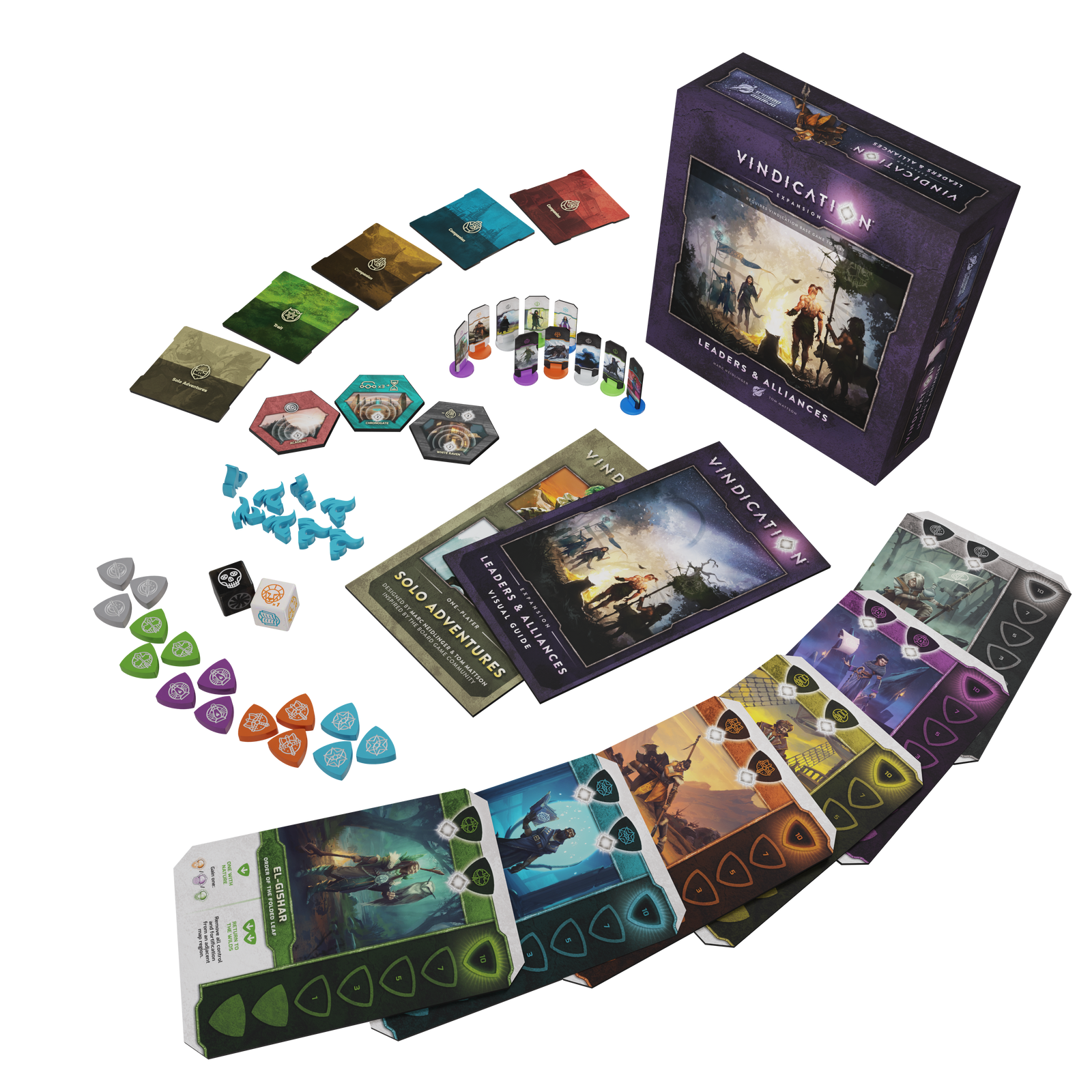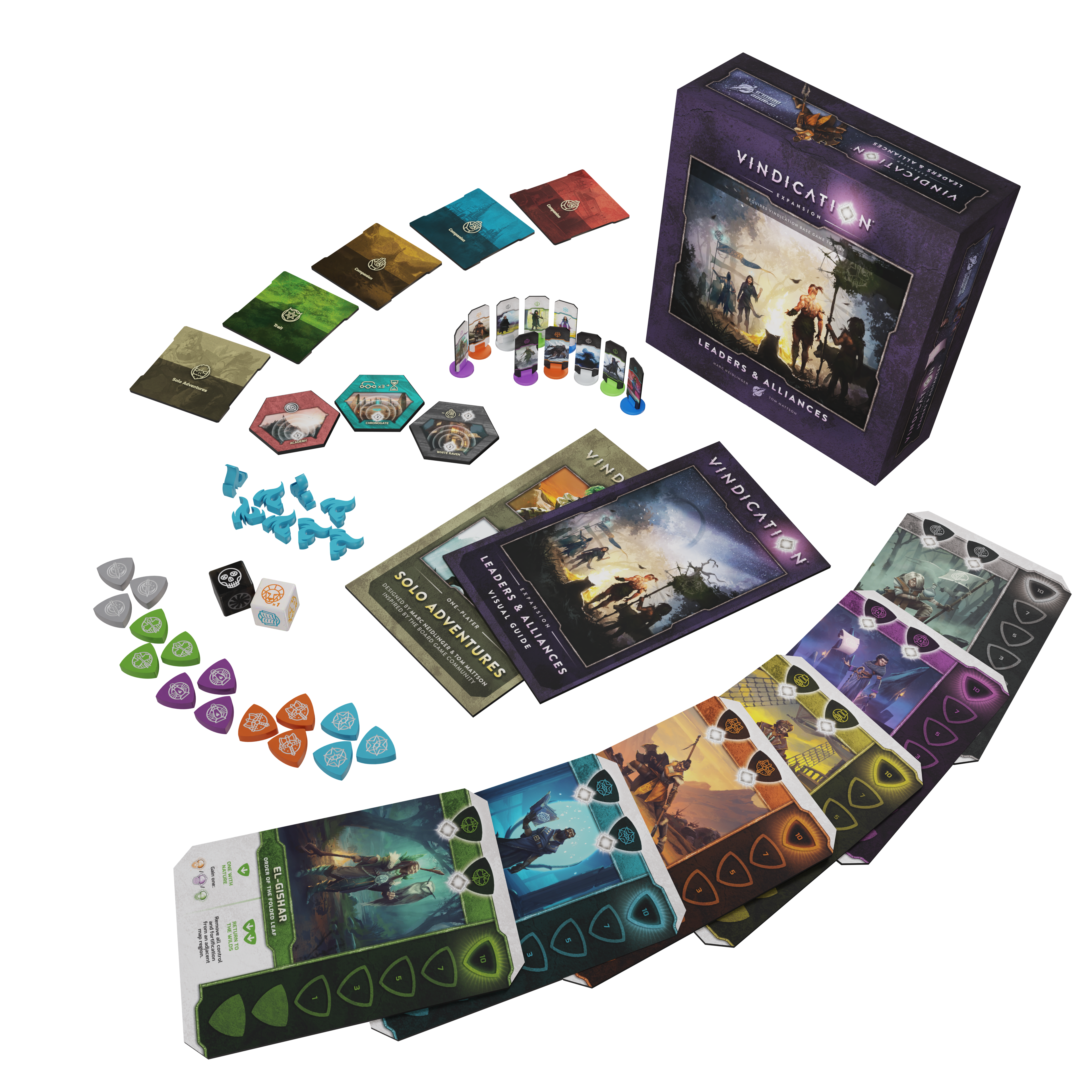 In Leaders and Alliances you will gain rapport with the leaders of Vindication's six mysterious guilds. This expansion also contains two different Solo Modes, alternate standees, a gargantuan mulberry scumbag.