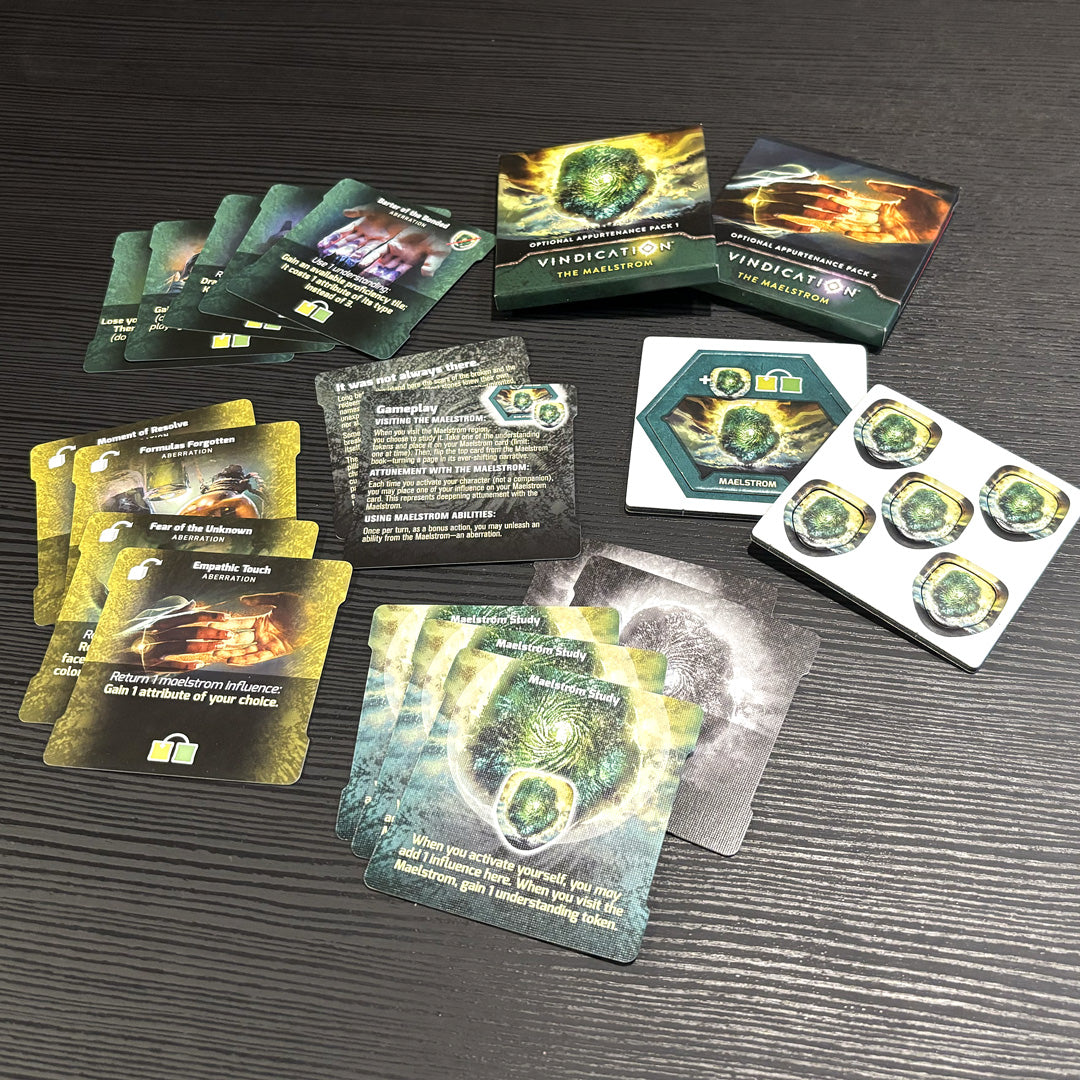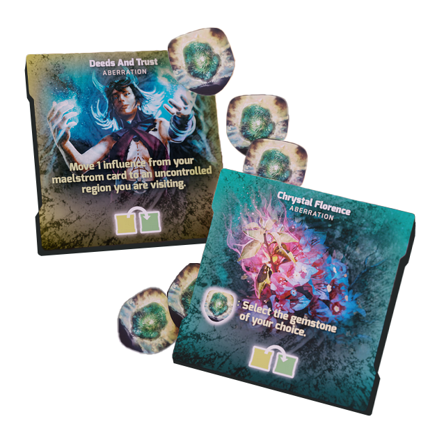 The Maelstrom is a dynamic map region tile, churning at the center of the map. Attune to the maelstrom when you activate your character, visit it to deepen your understanding, and use these resources to trigger Maelstrom aberrations to bend the rules of the game, flipping through this sets’ aberration cards like a book to access different effects. This two-pack mini-expansion introduces significant gameplay impact with very few components.